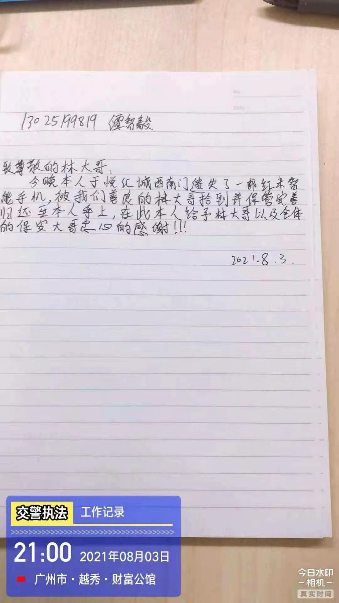 2021年8月3日,金年会官网平台-金年会(中国)一站式服务平台驻西村悦汇城保安员林伟强像往常一样准备交接岗,当走至负一西南门门口的时候发现地上有一部黑色智能手机,林伟强在现场等待失主并上报了当班值班经理,不一会儿失主打电话过来,核实了失主身份后将失物归还。失主十分感动,并现场手写感谢信一封以表谢意。